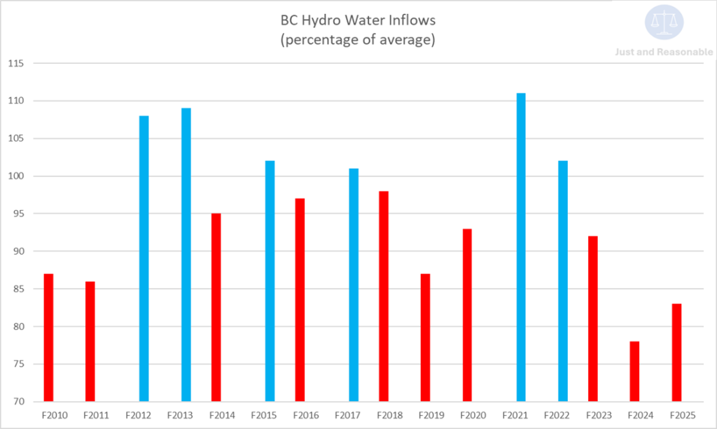 But the water inflows into BC Hydro’s dams improved slightly in F2025 as well, although they’re still not up to the historical average, as we can see from the data below: